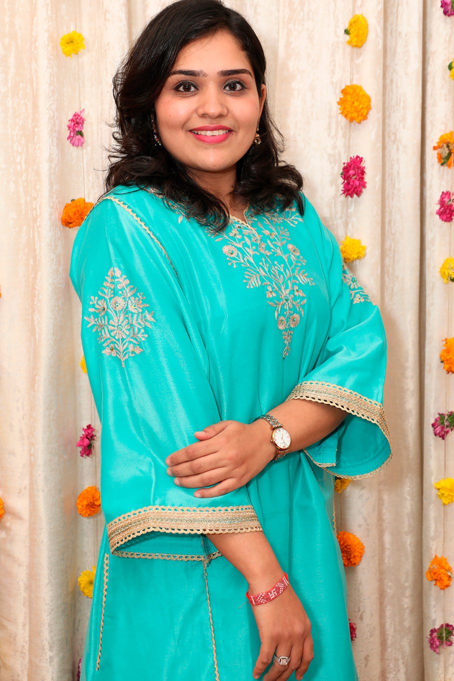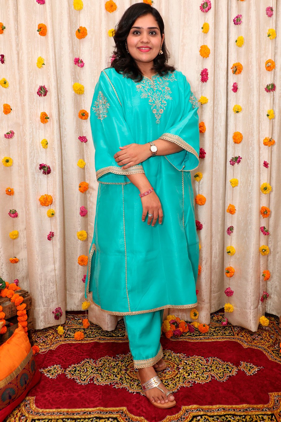 Aqua Embroidered Chanderi Choga Set with Straight Pants
