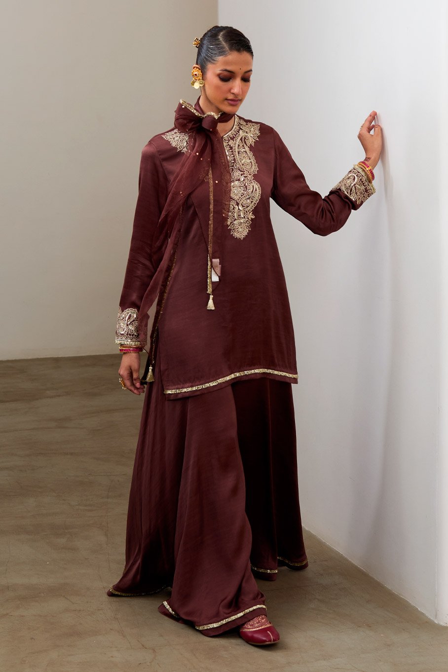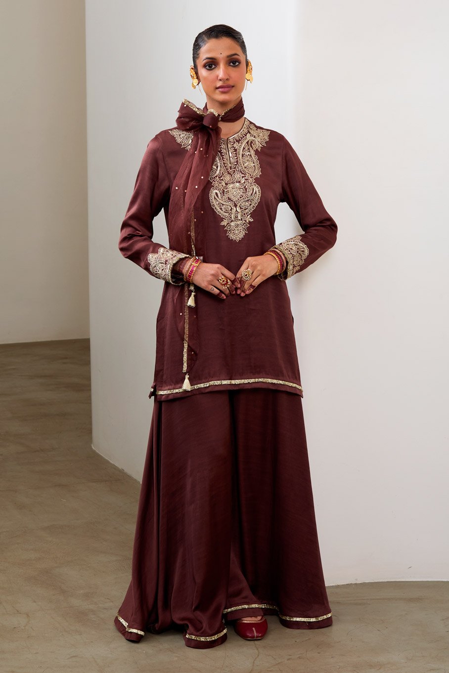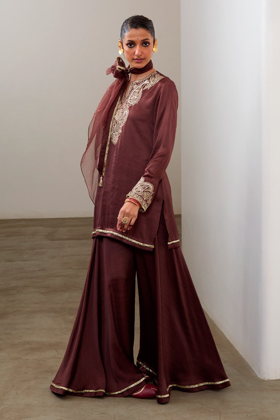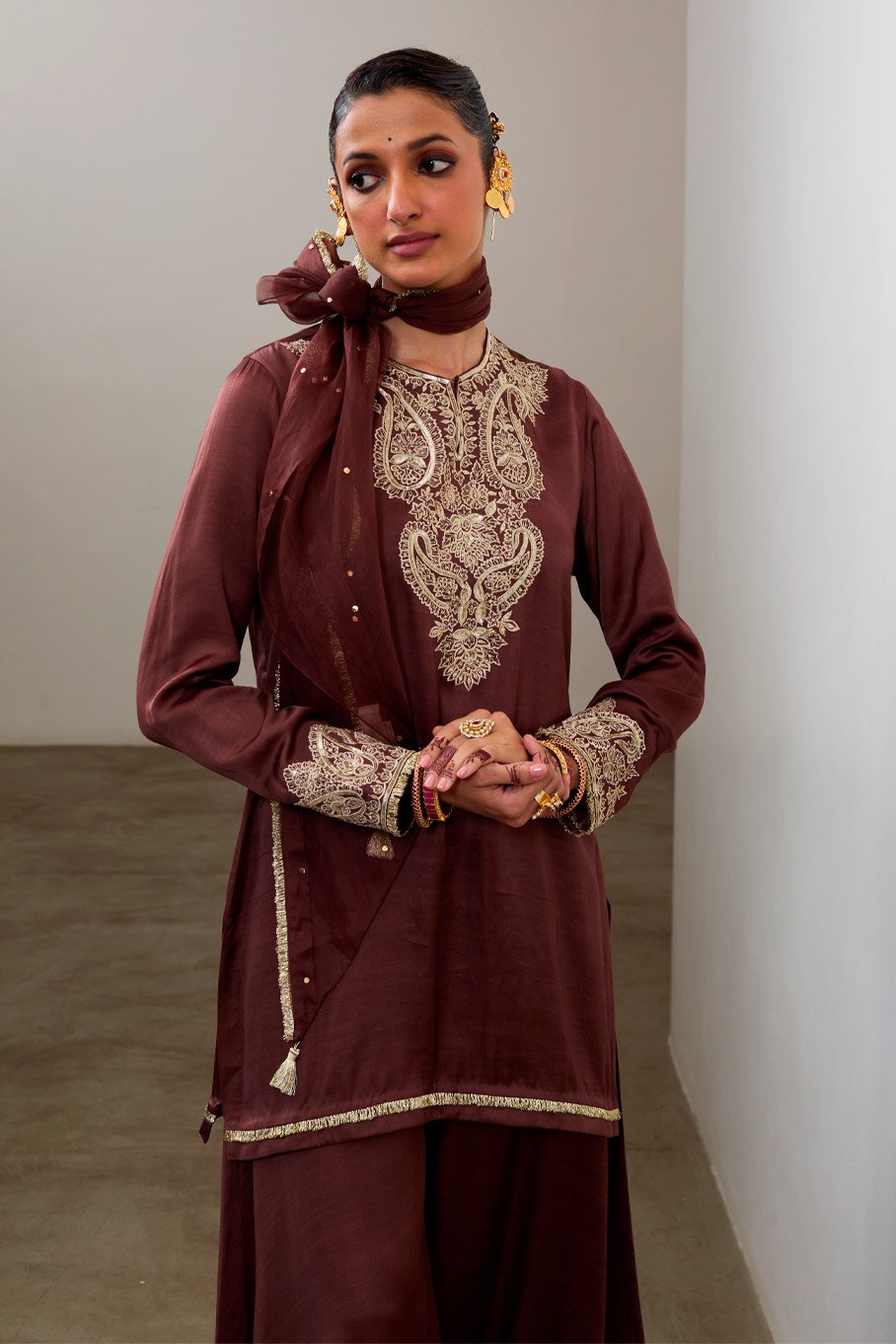 Brown Silk Embroidered Short kurti & Sharara Pant with Pure Organza Badla sash