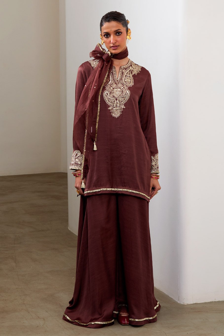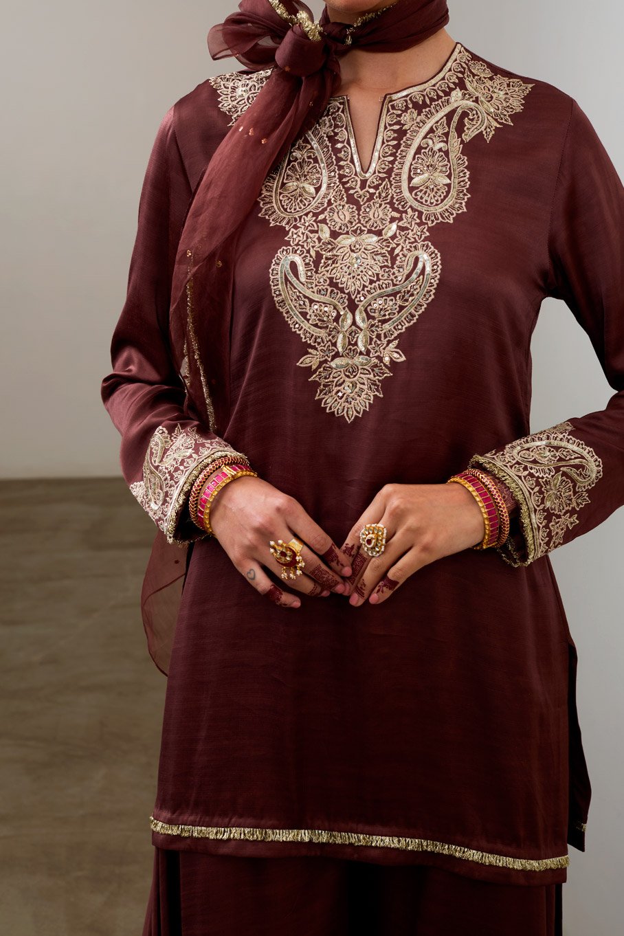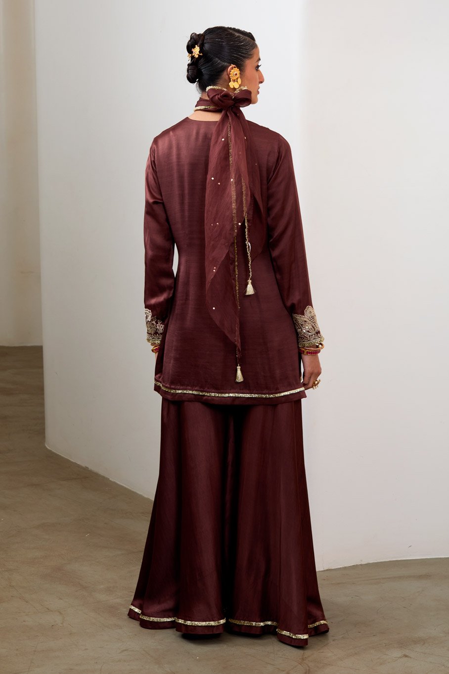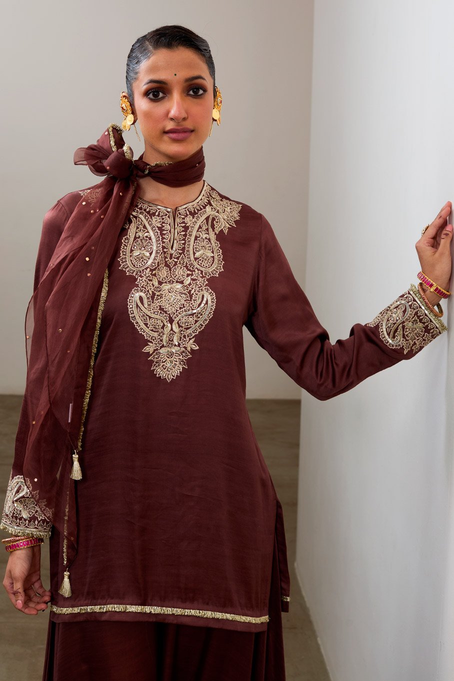 Brown Silk Embroidered Short kurti & Sharara Pant with Pure Organza Badla sash
