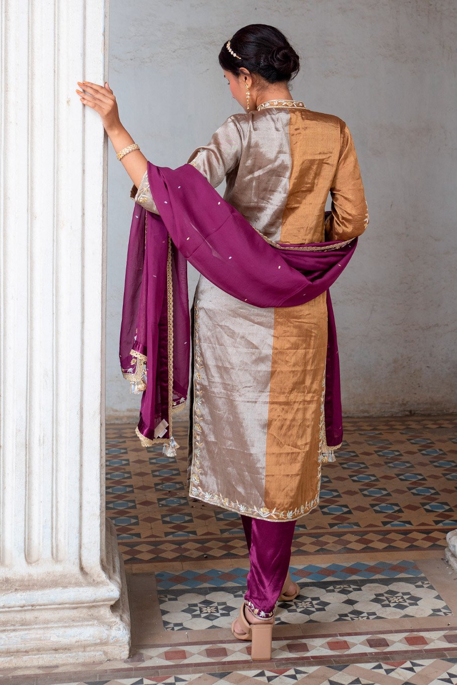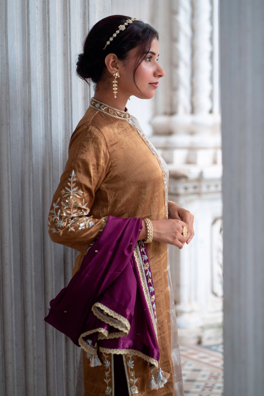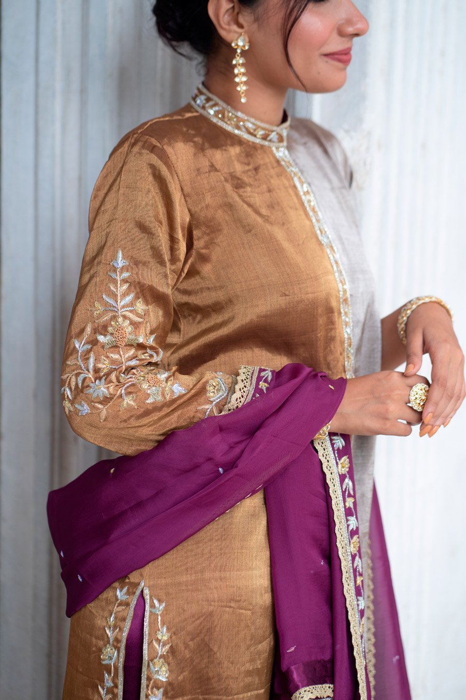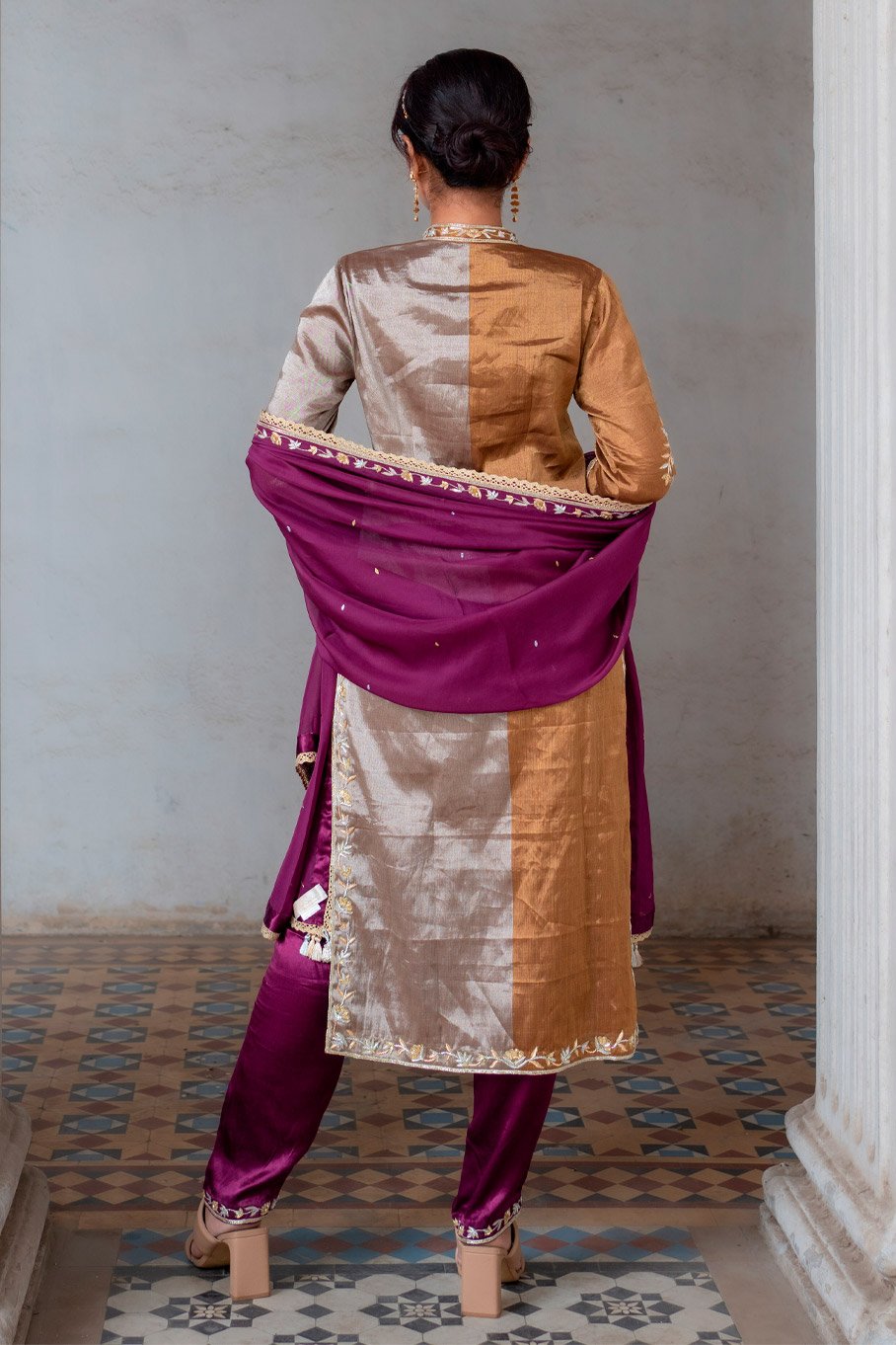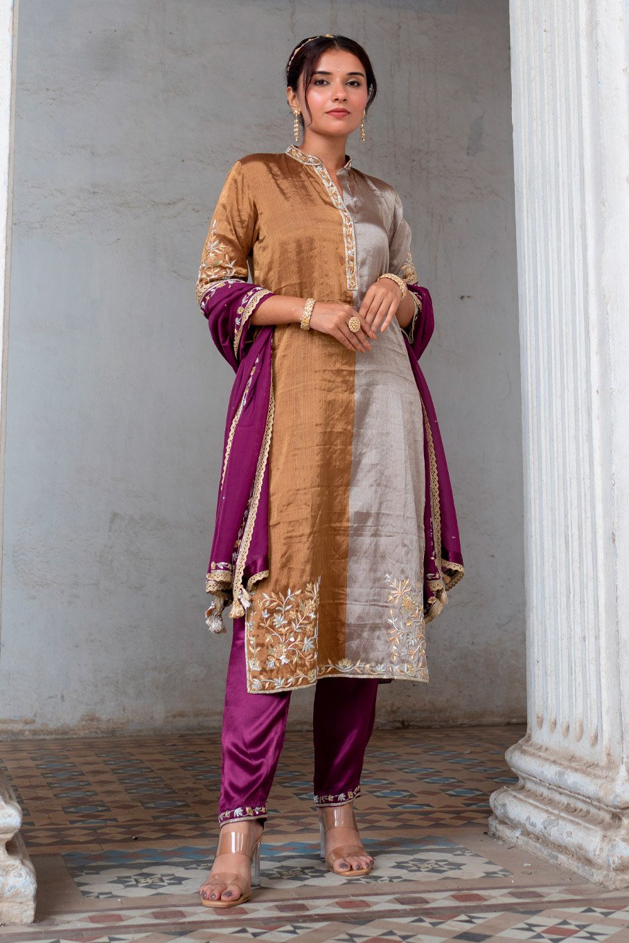 - Design: Dark Gold and Silver Embroidered Kurta with Ivory Embroidered Pant and Dupatta