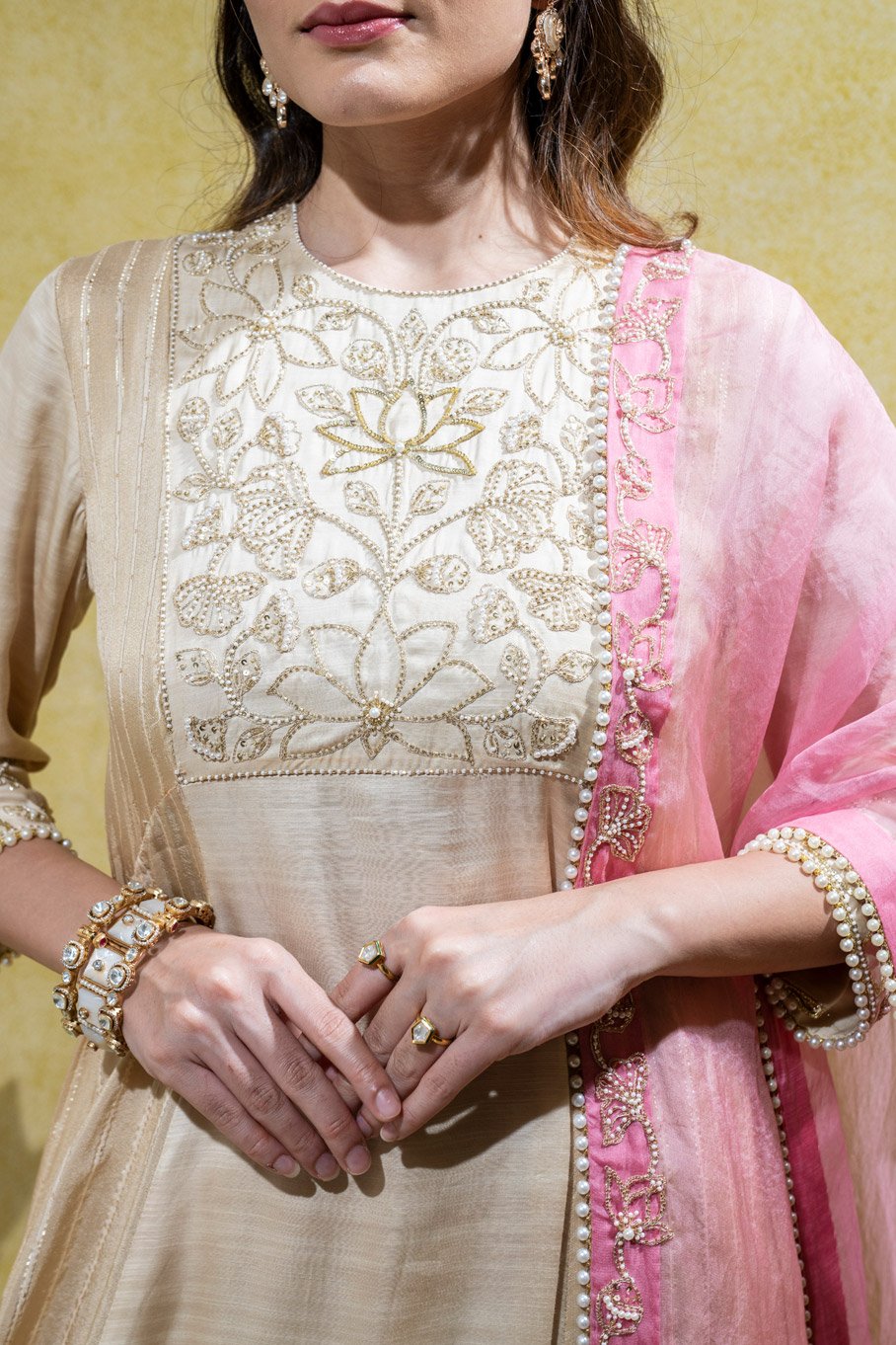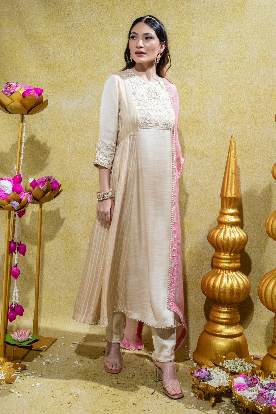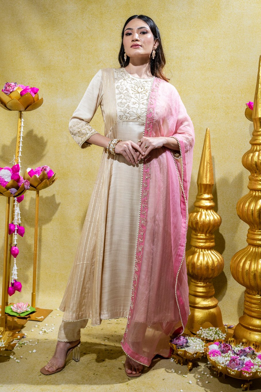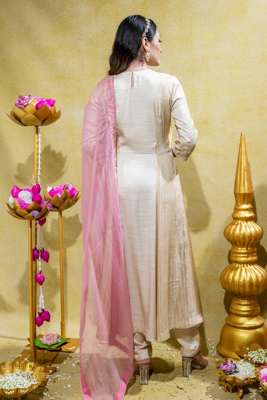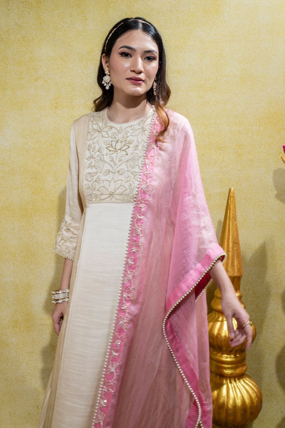 Ivory anarkali embroidered kurta , pant & pink embroidered silk organza dupatta.