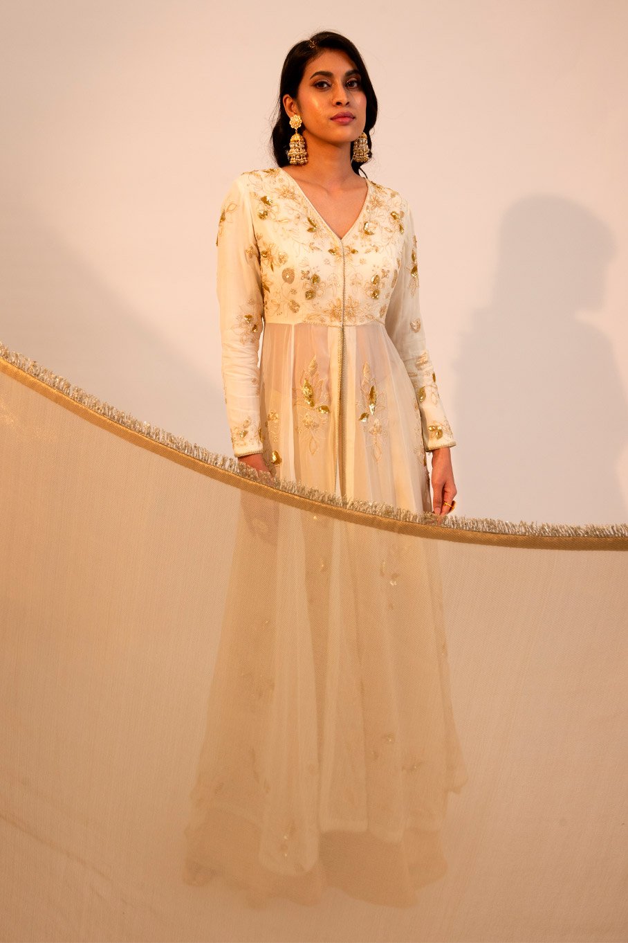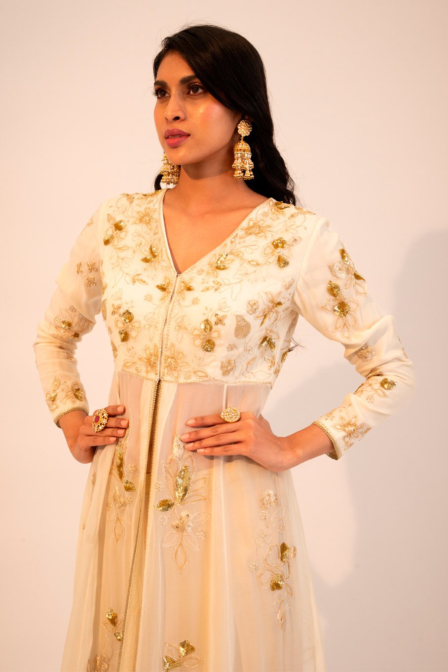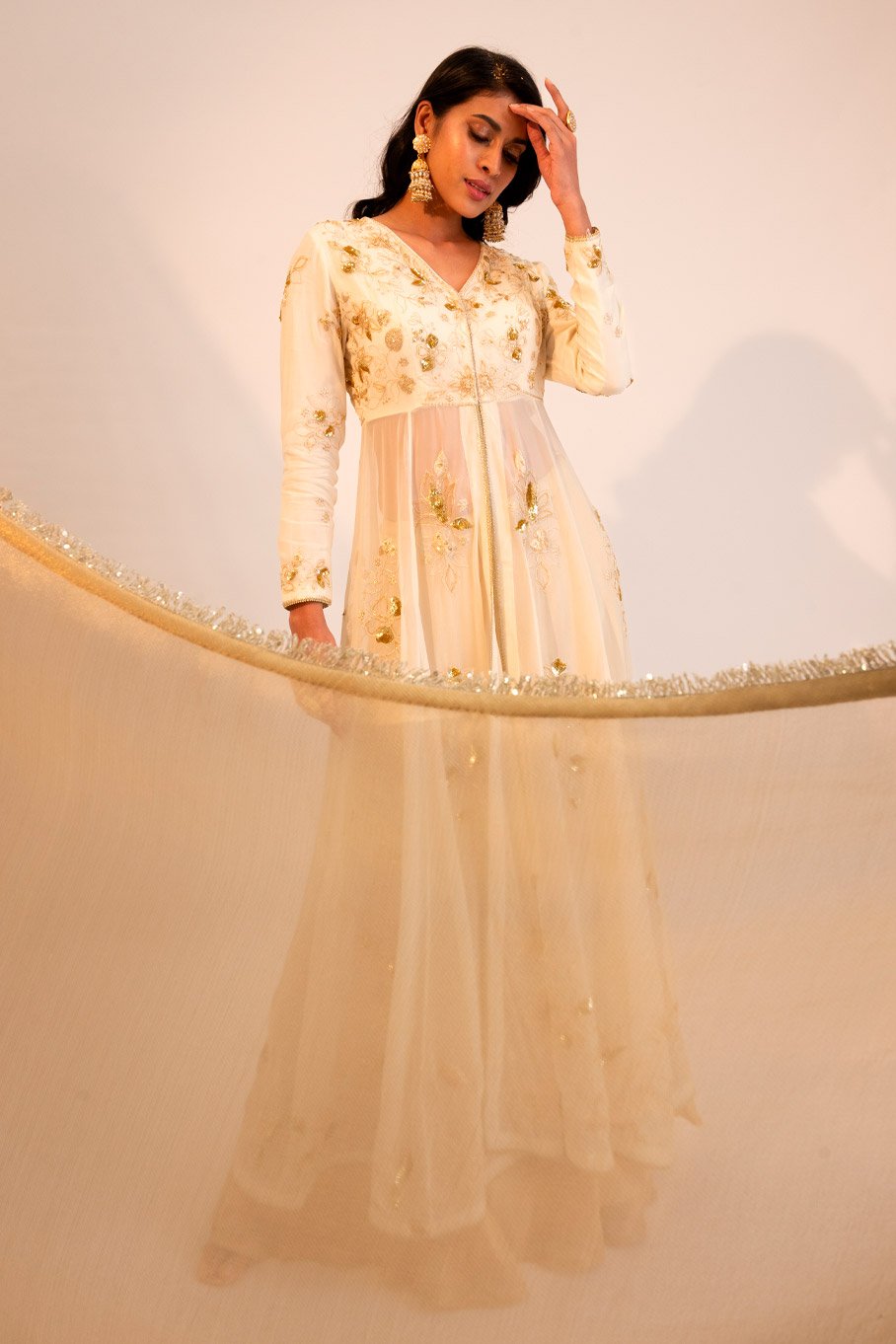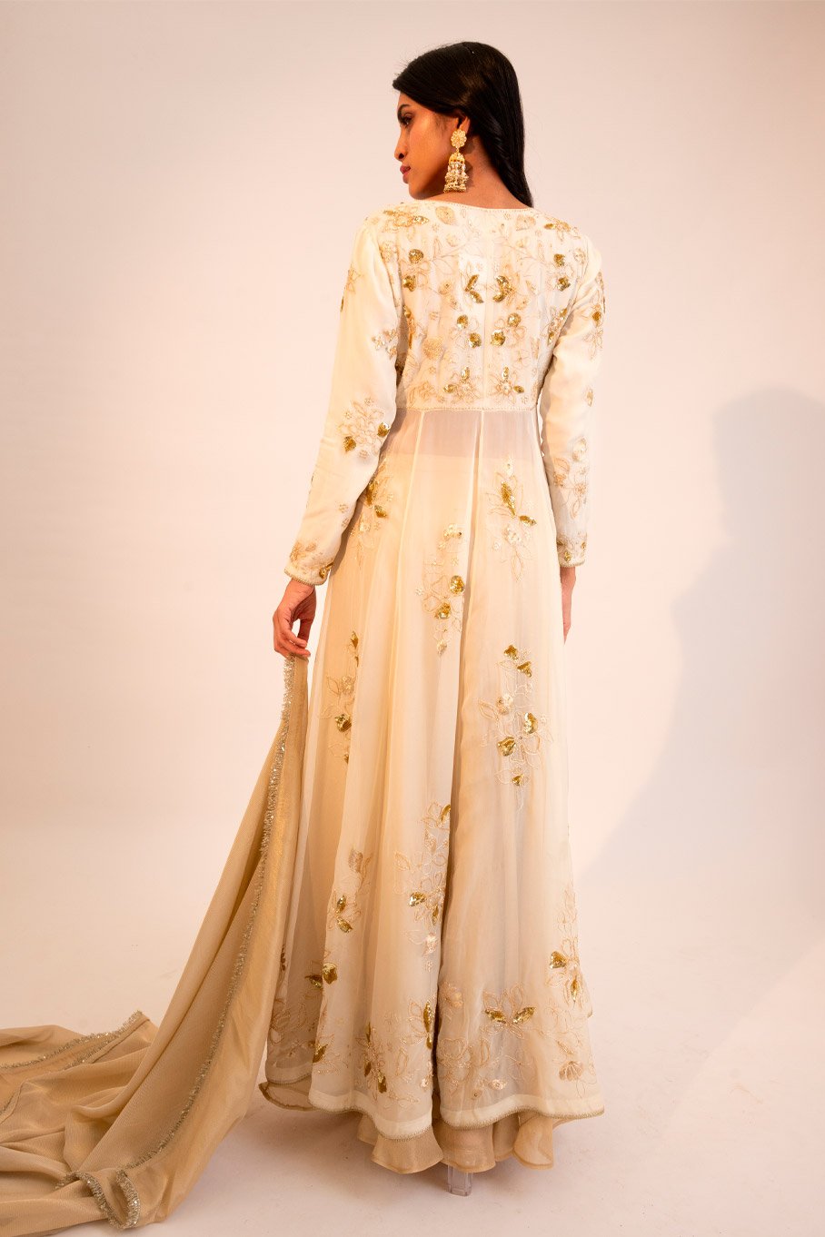 Ivory Embroidered Open Anarkali Paired With Tissue Lehenga & Dupatta