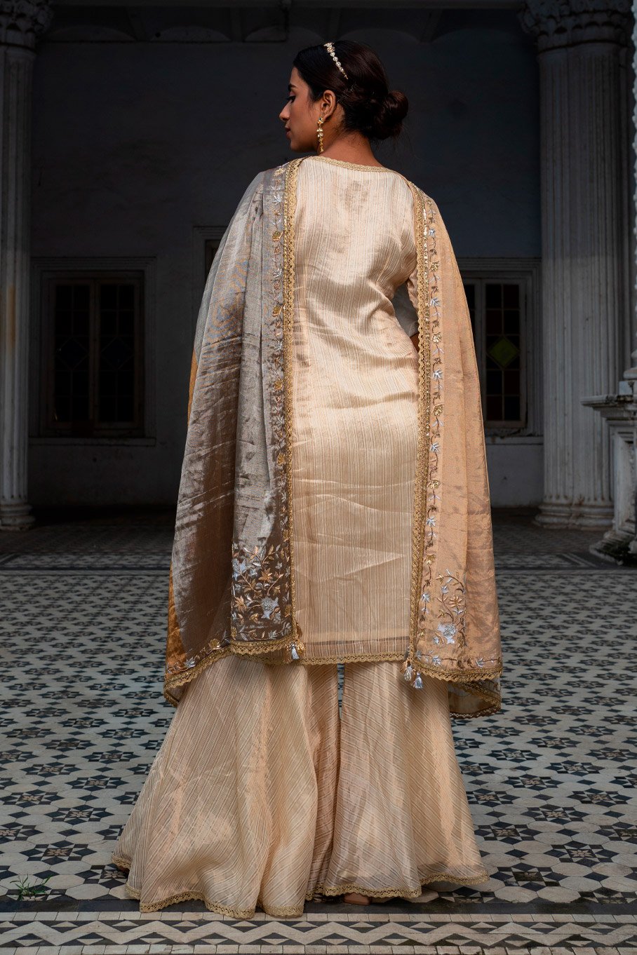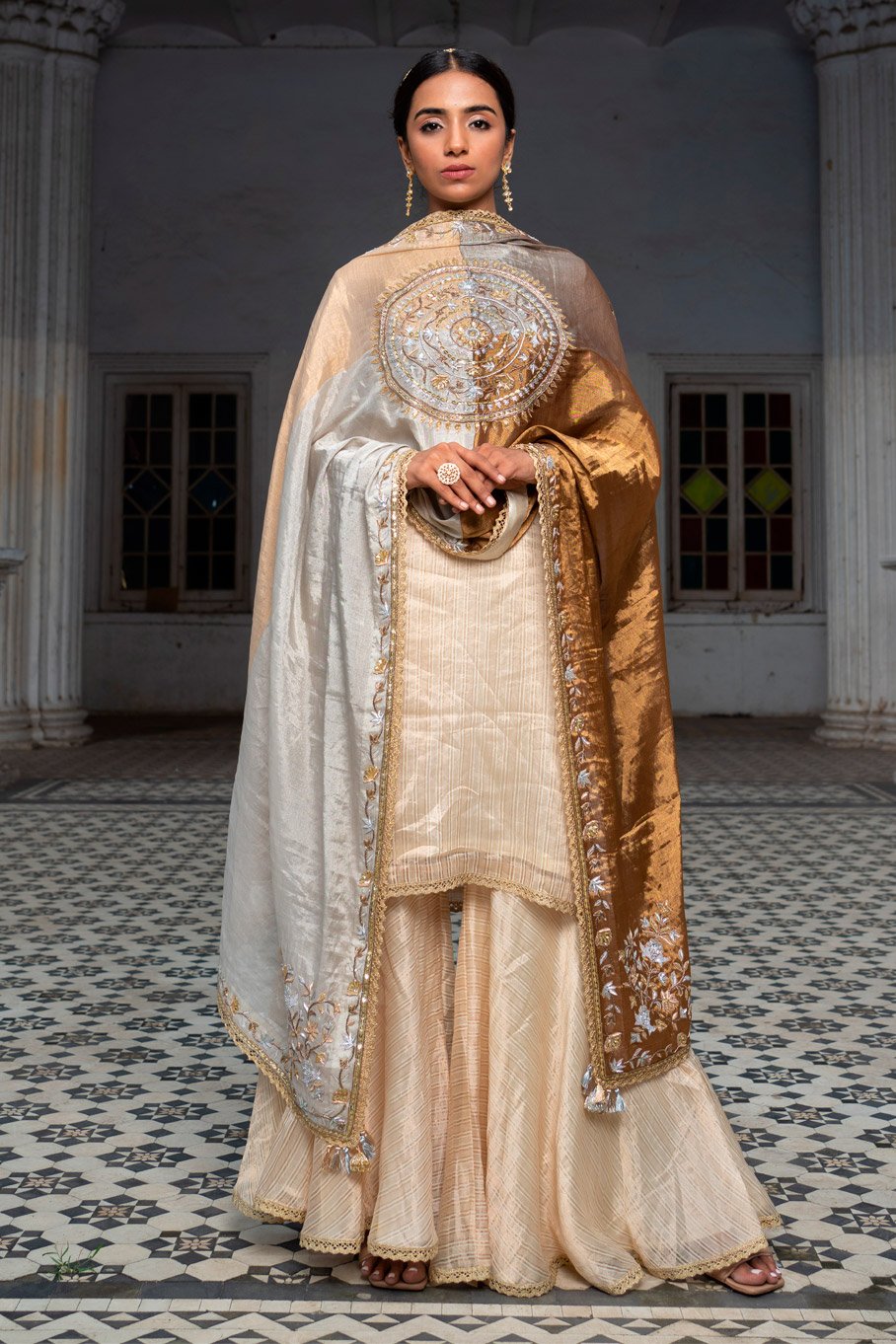 - Design: Ivory Zari Striped Kurti Gharara with Gold Crochet Borders and Signature Suvarna Zari Tissue Embroidered Dupatta