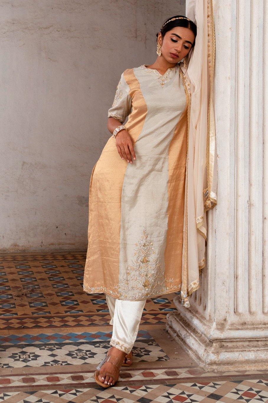 Light Silver And Gold Zari Tissue Embriodered Kurta With Ivory Embroidered Pant And Dupatta