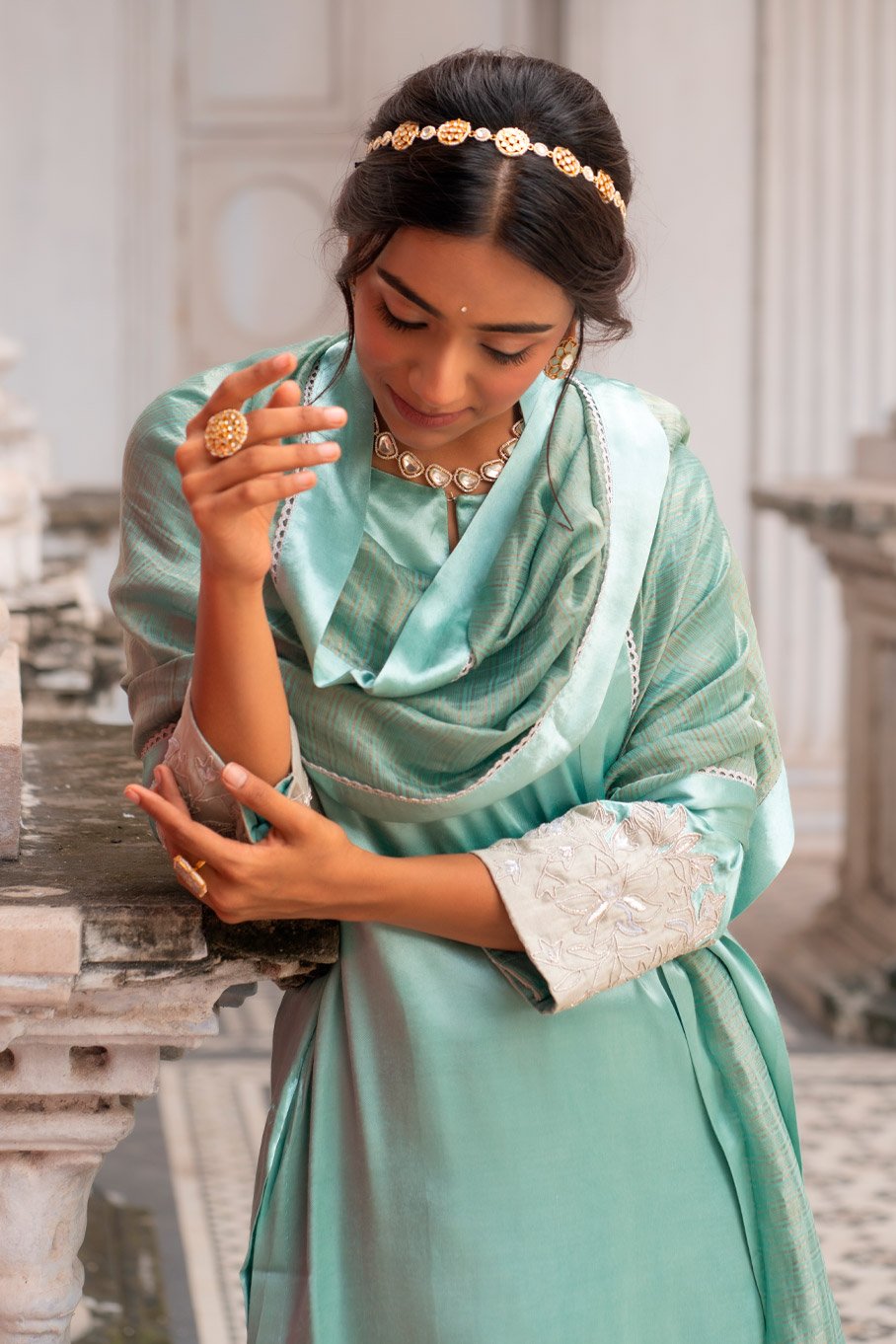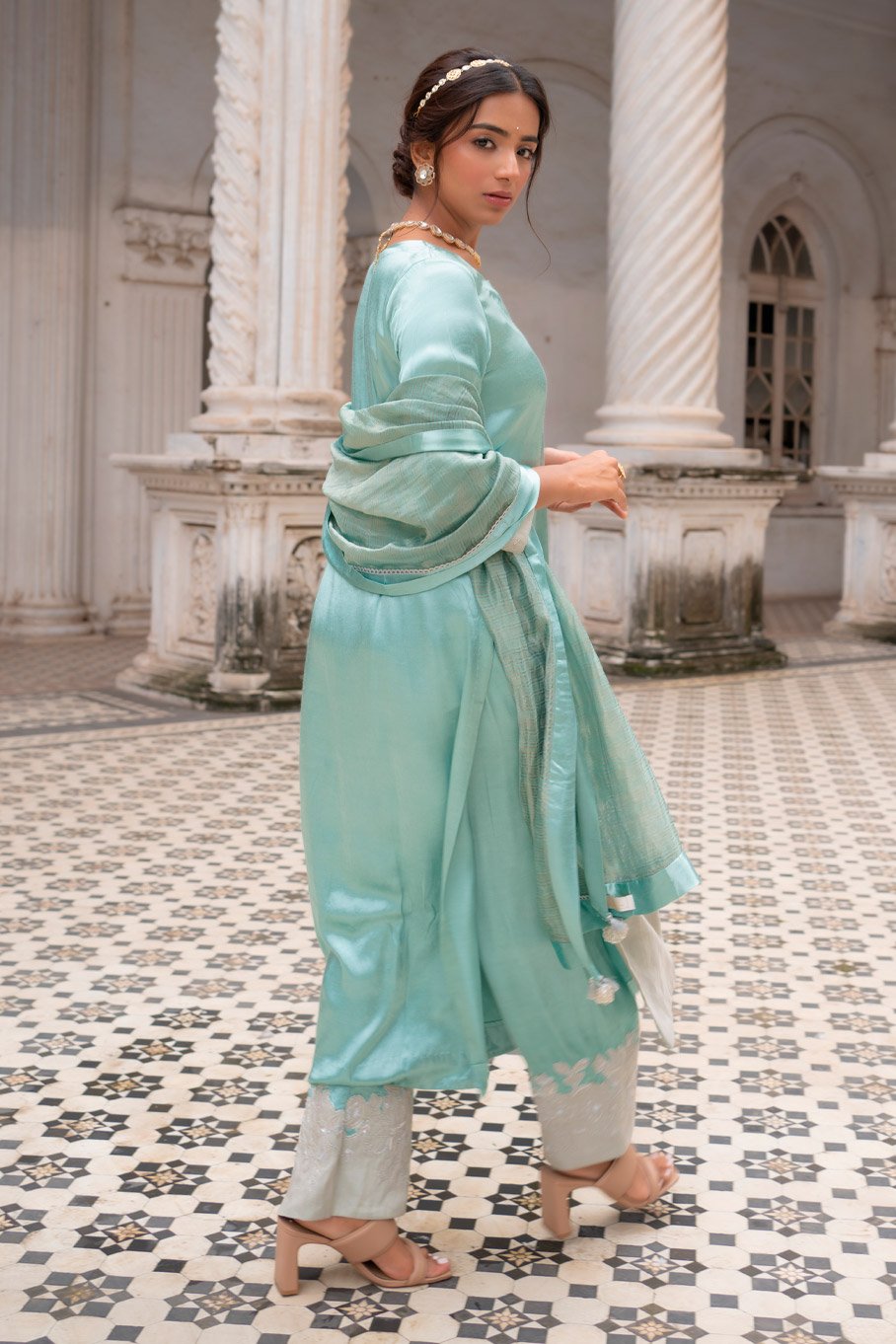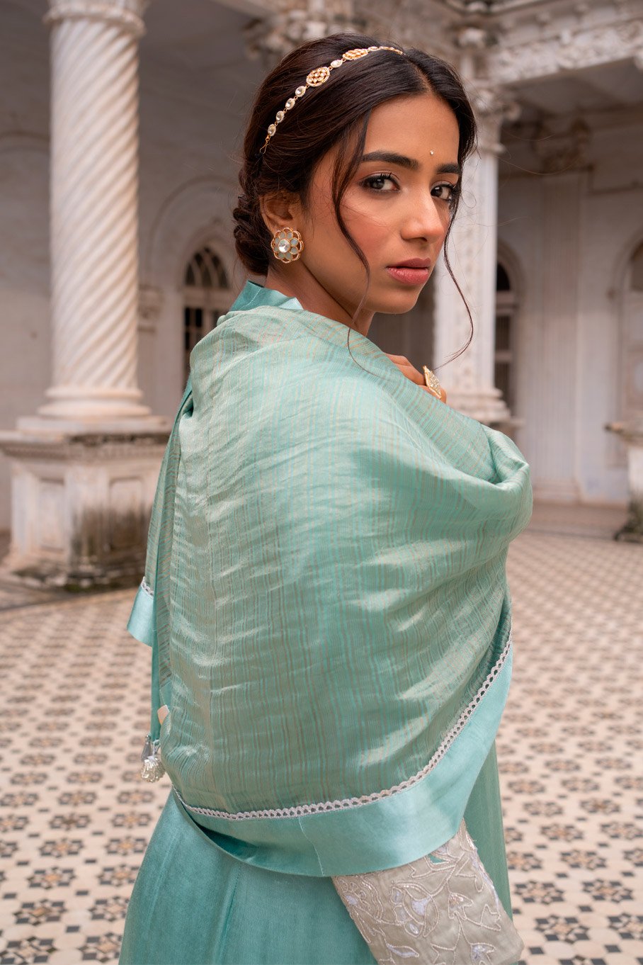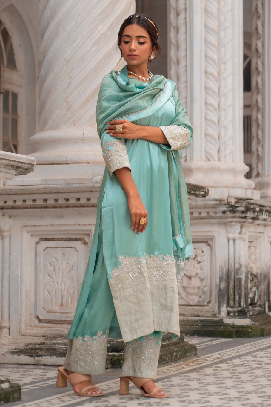 - Design: Mint and Silver Zari Tissue Cutwork Embroidered Kurta Set with Dupatta