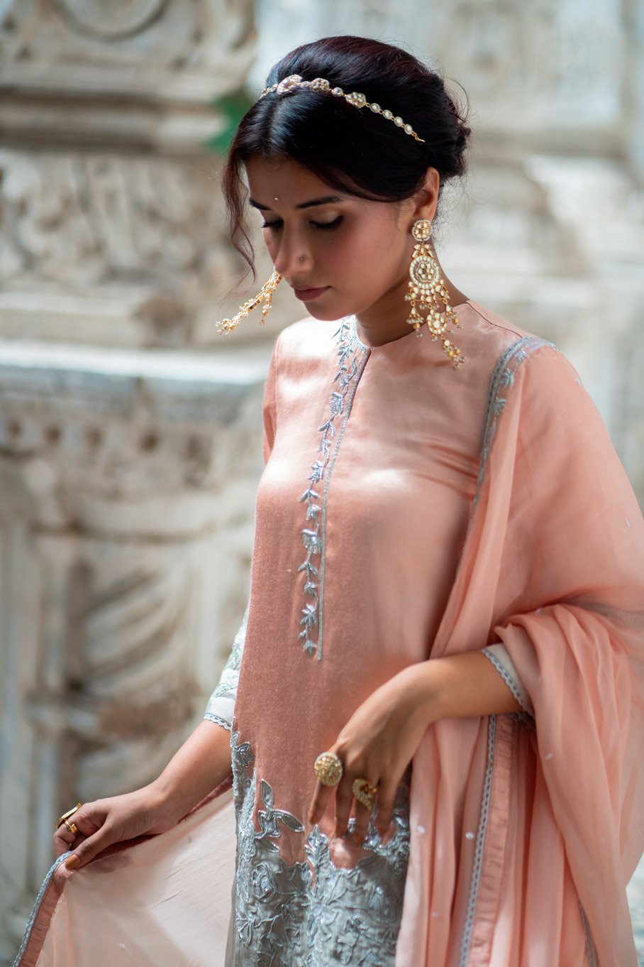 - Design: Peach and Silver Cutwork Embroidered Kurti Sharara with Dupatta