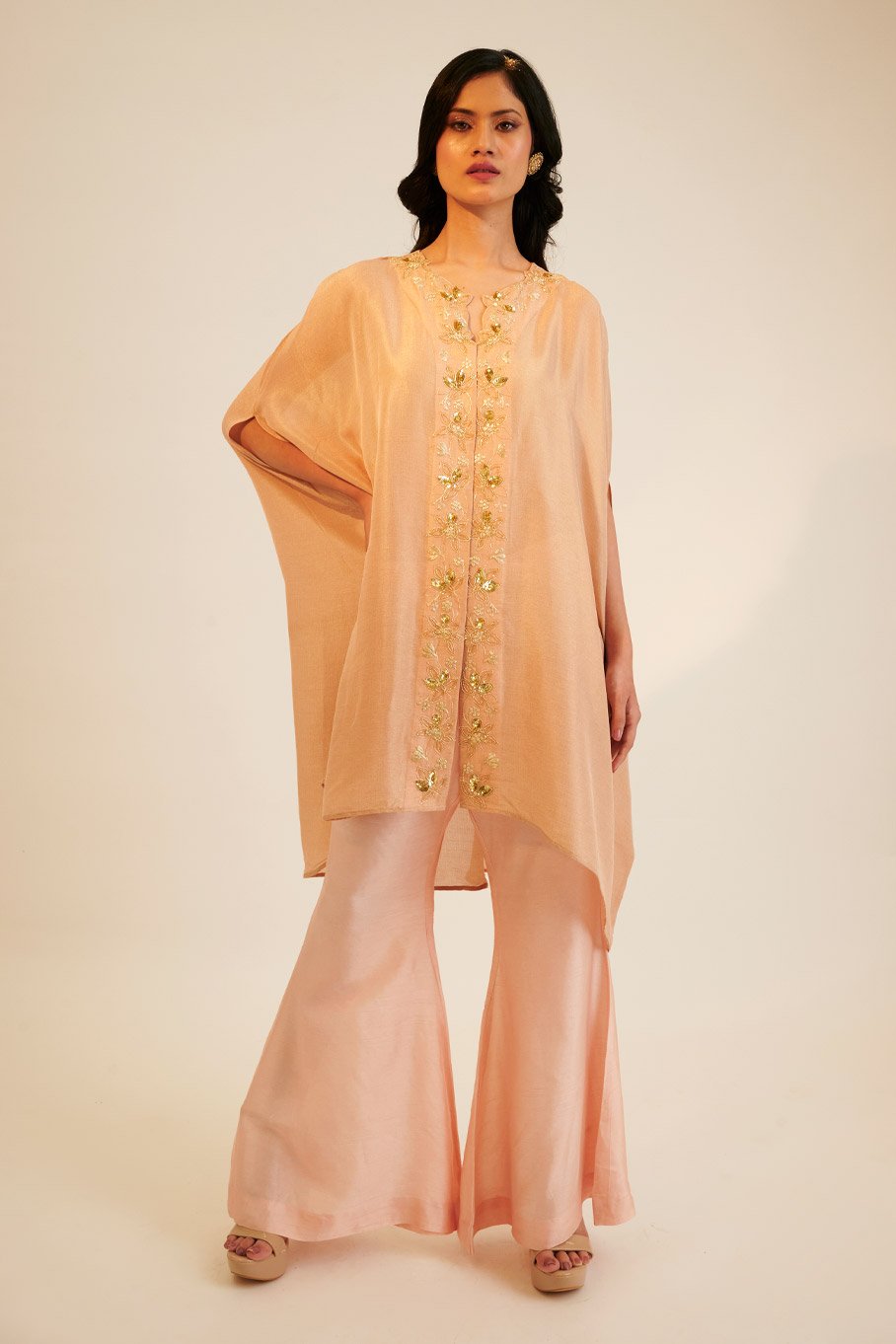 Peach Embroidered Cape Top With Silk Bell Bottom Pant