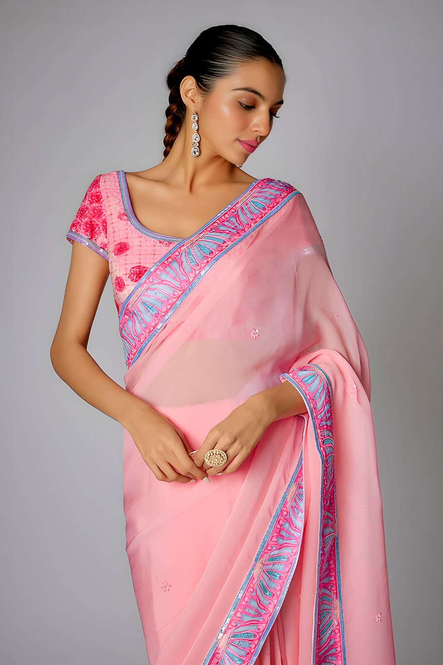 Pink Embroidered Organza Saree Paired With Embroidered & Crepe Blouse