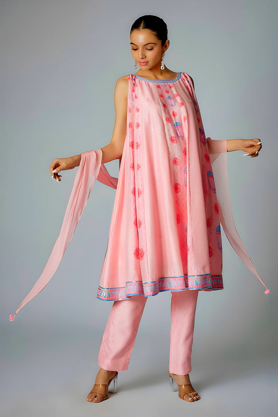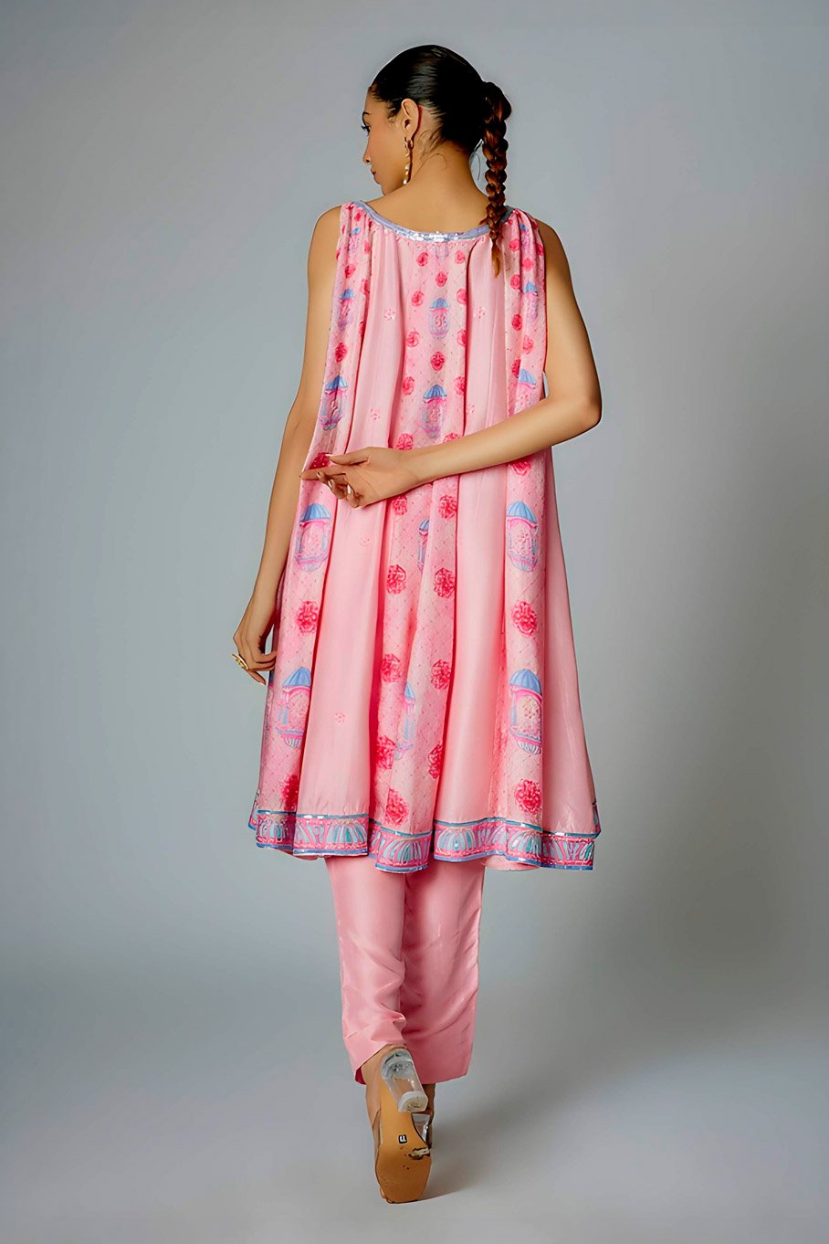 Pink Multipaneled Embroidered Anarkali Paired With Silk Pants & Organza Sash