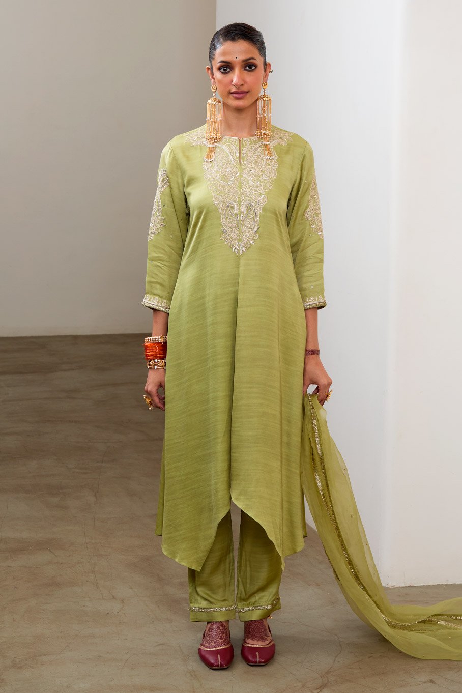 Pista Silk Embroidered Asymmetric Kurta & Pant with Pure Organza Badla Dupatta