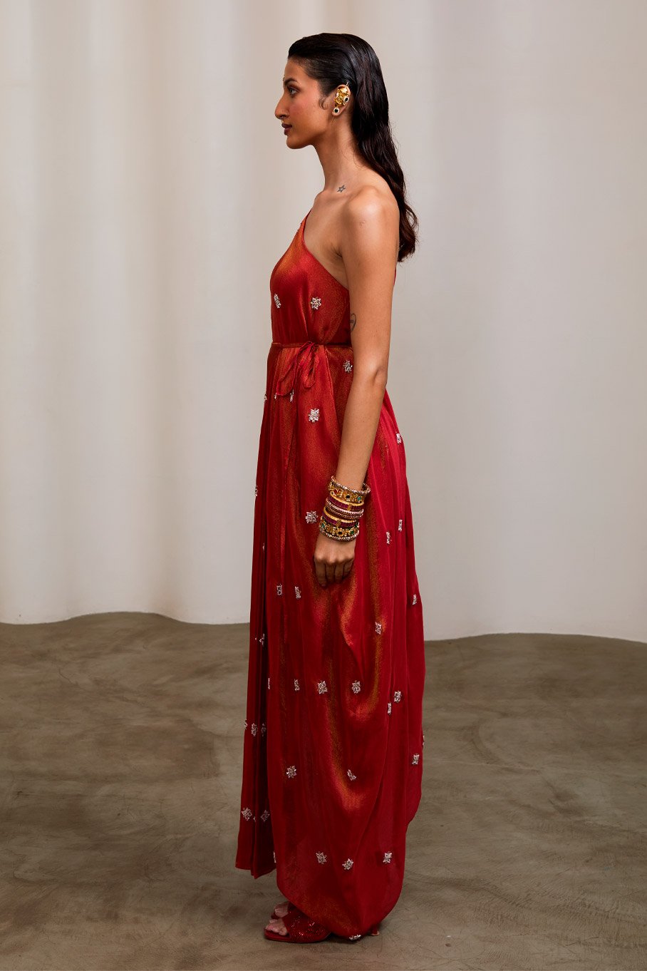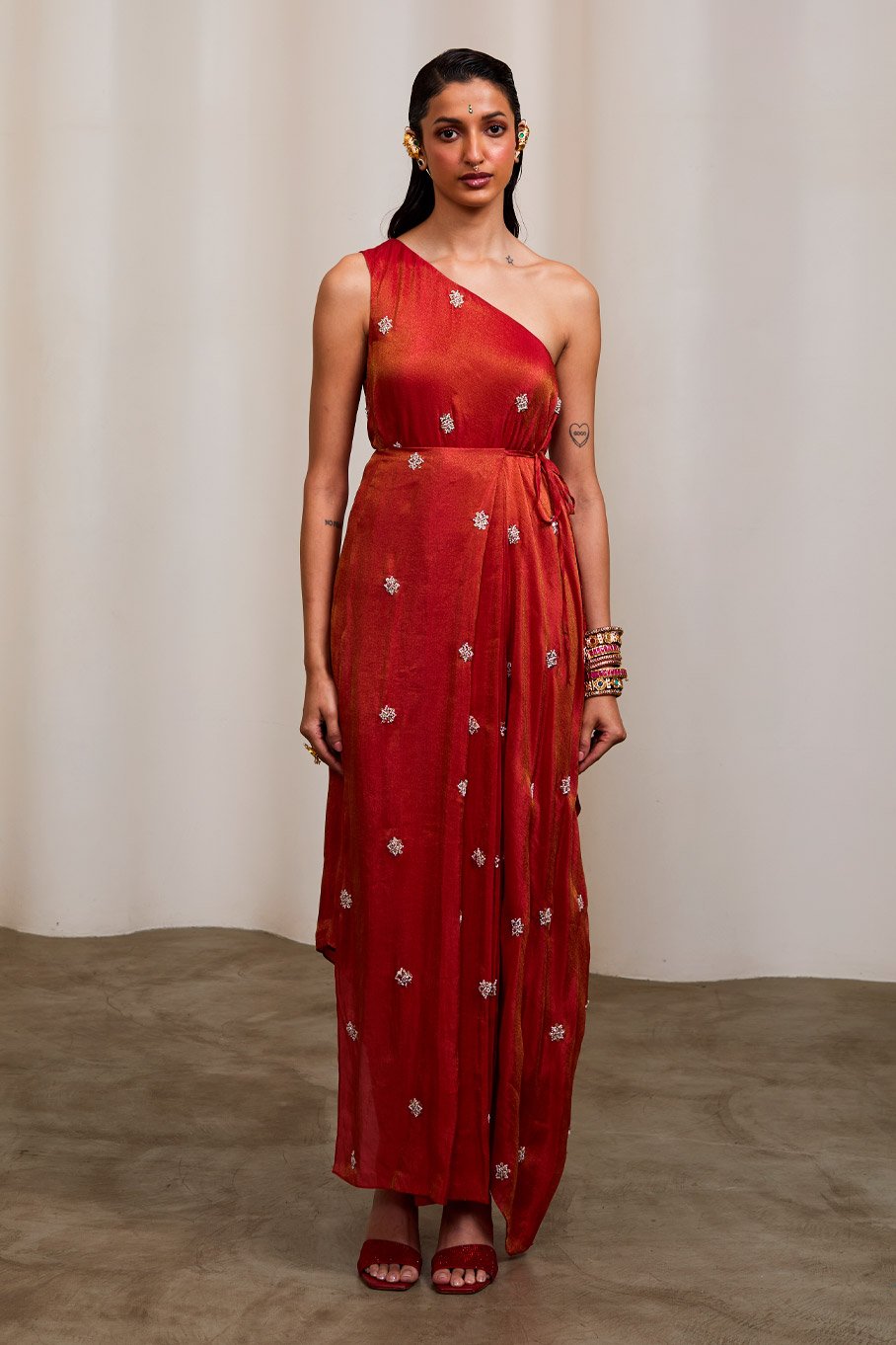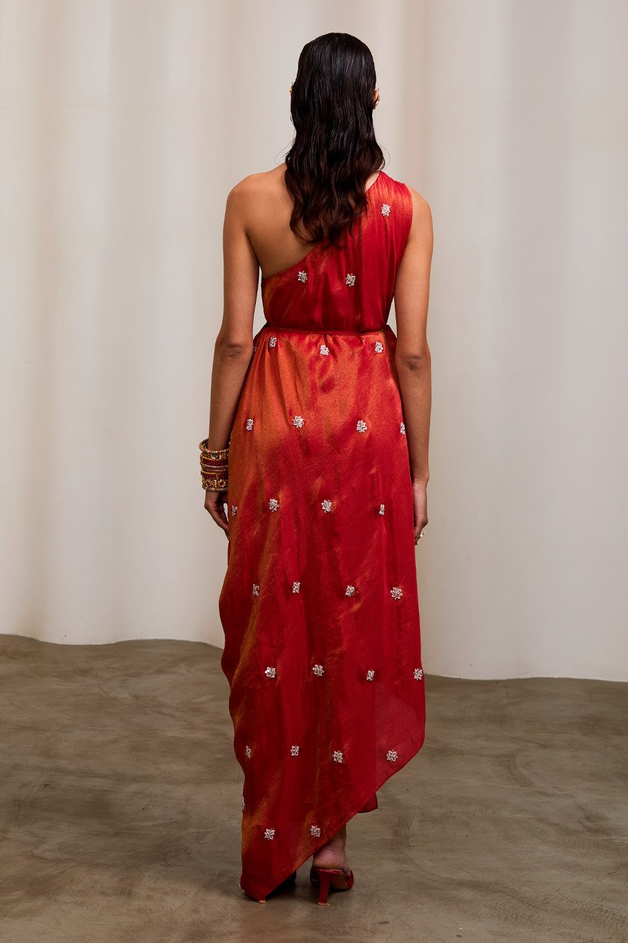 - Design: Red Embroidered One Shoulder Dress with Pleats Tie Up