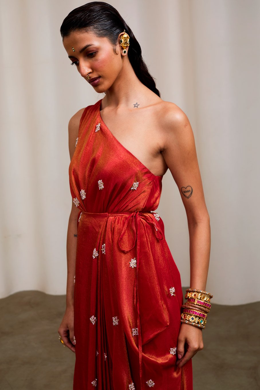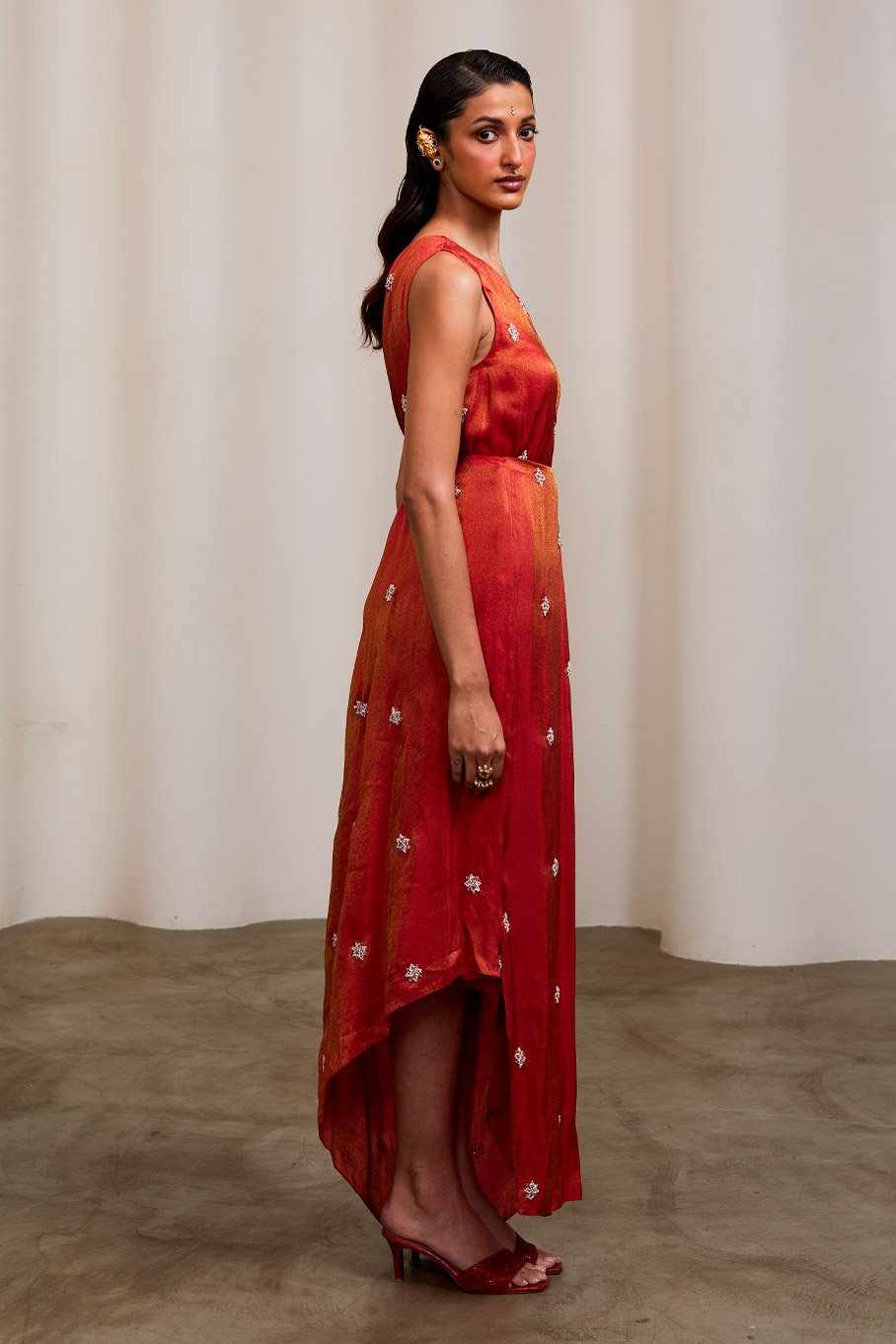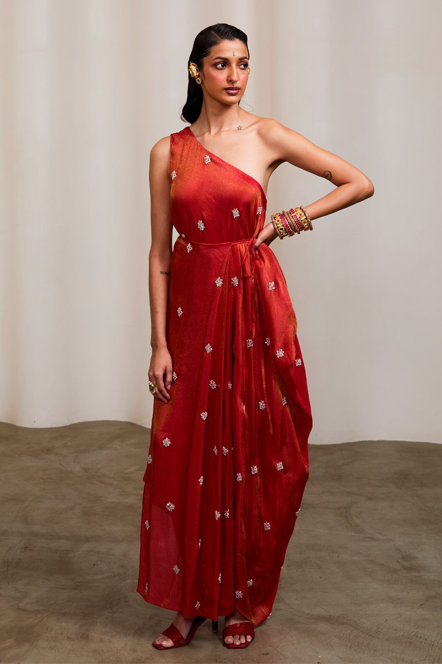 - Design: Red Embroidered One Shoulder Dress with Pleats Tie Up