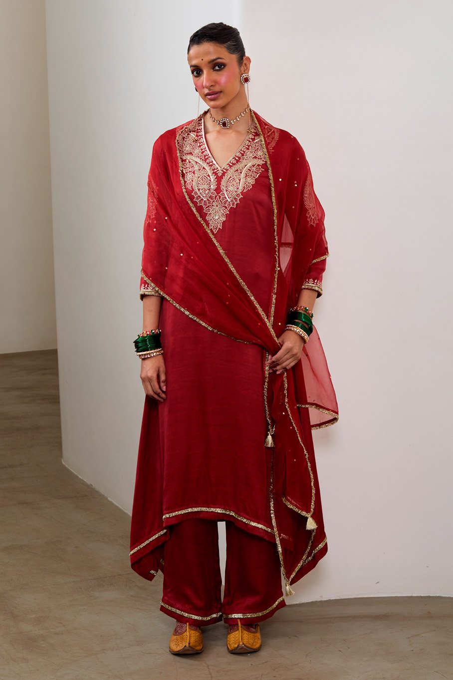 Red Silk Embroidered Asymmetric kurta & Pant paired with Pure Organza Badla Dupatta