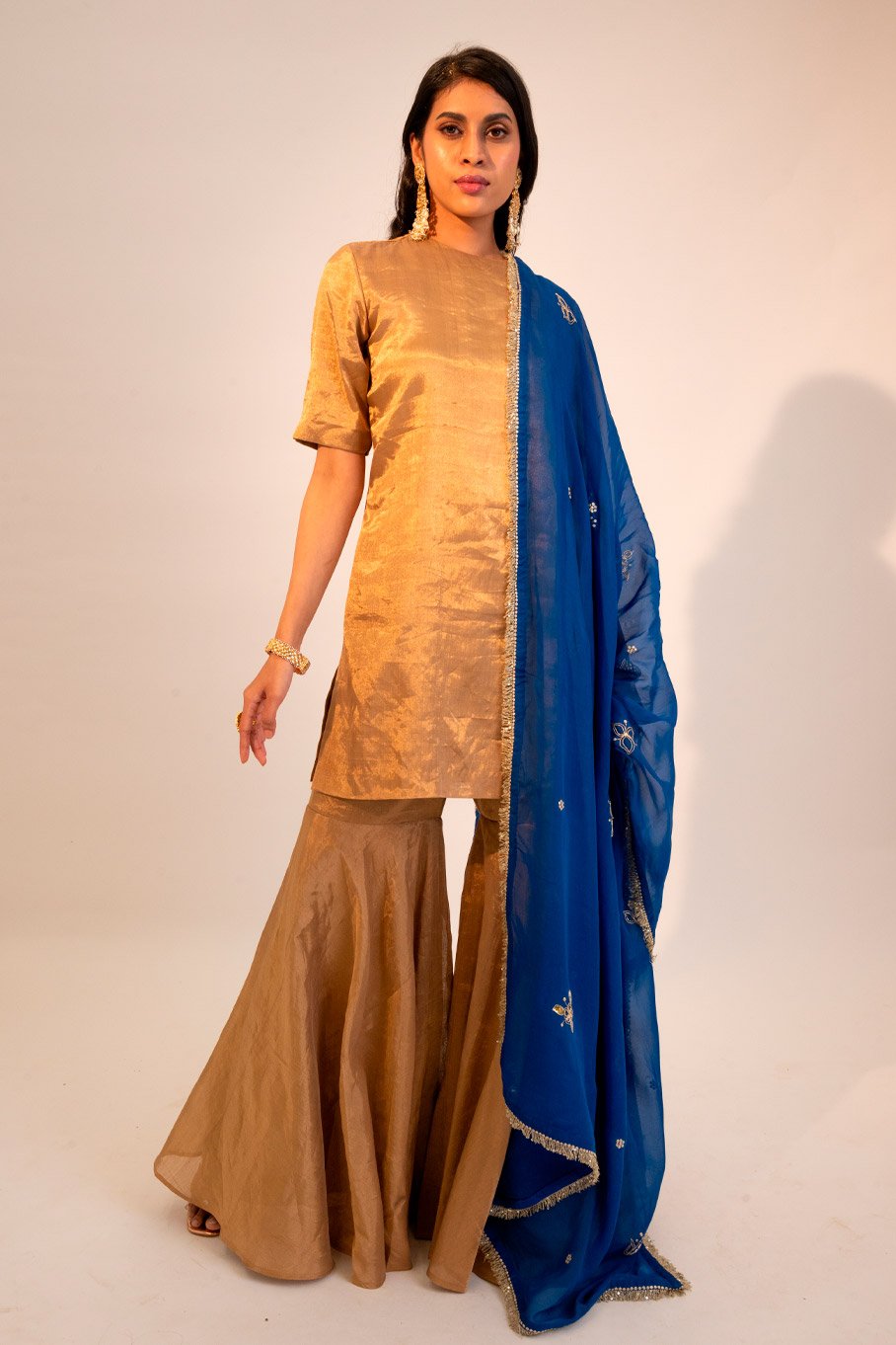 Signature Zari Tissue Gold Kurti & Garara Paired With Electric Blue Embroidered Organza Dupatta