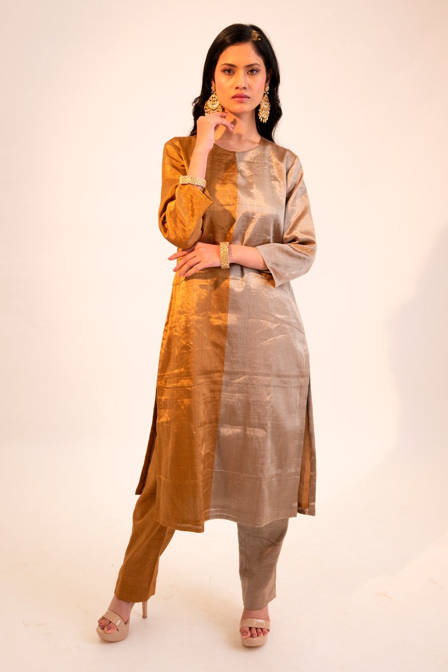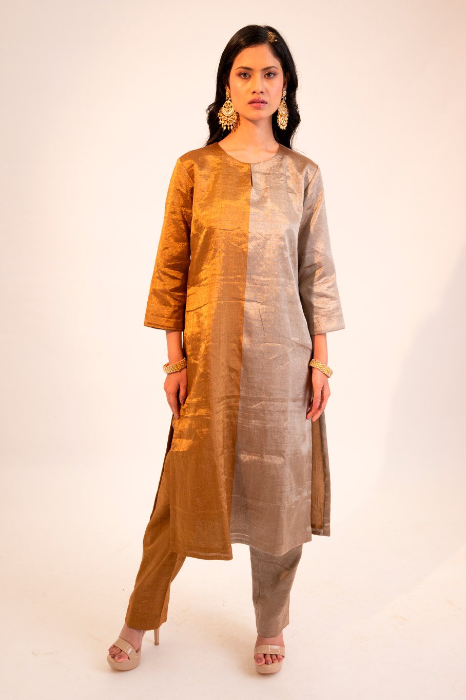 Signature Zari Tissue Half & Half Kurta Set in Dark Gold & Silver