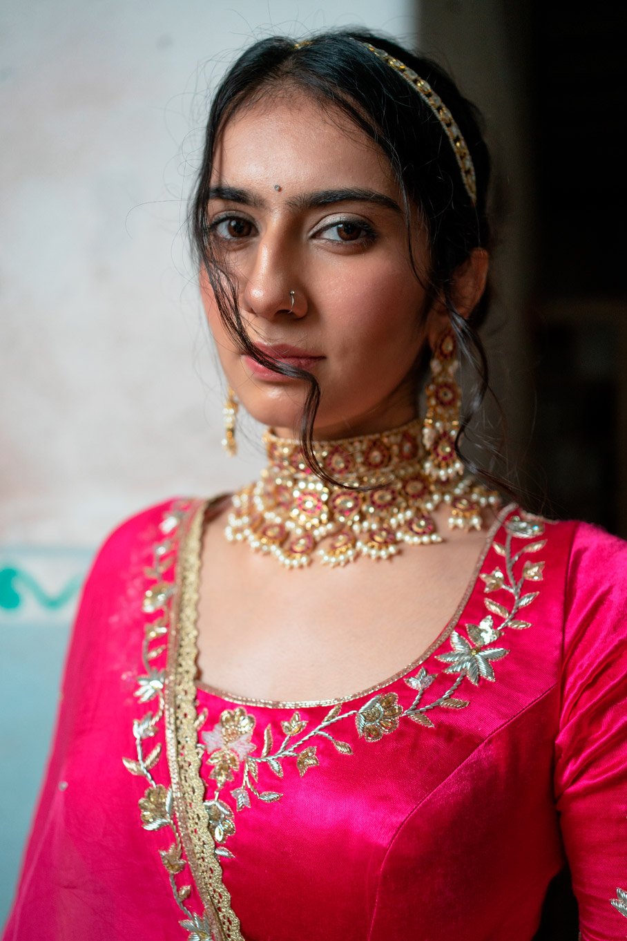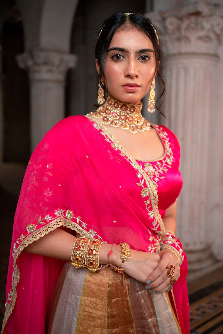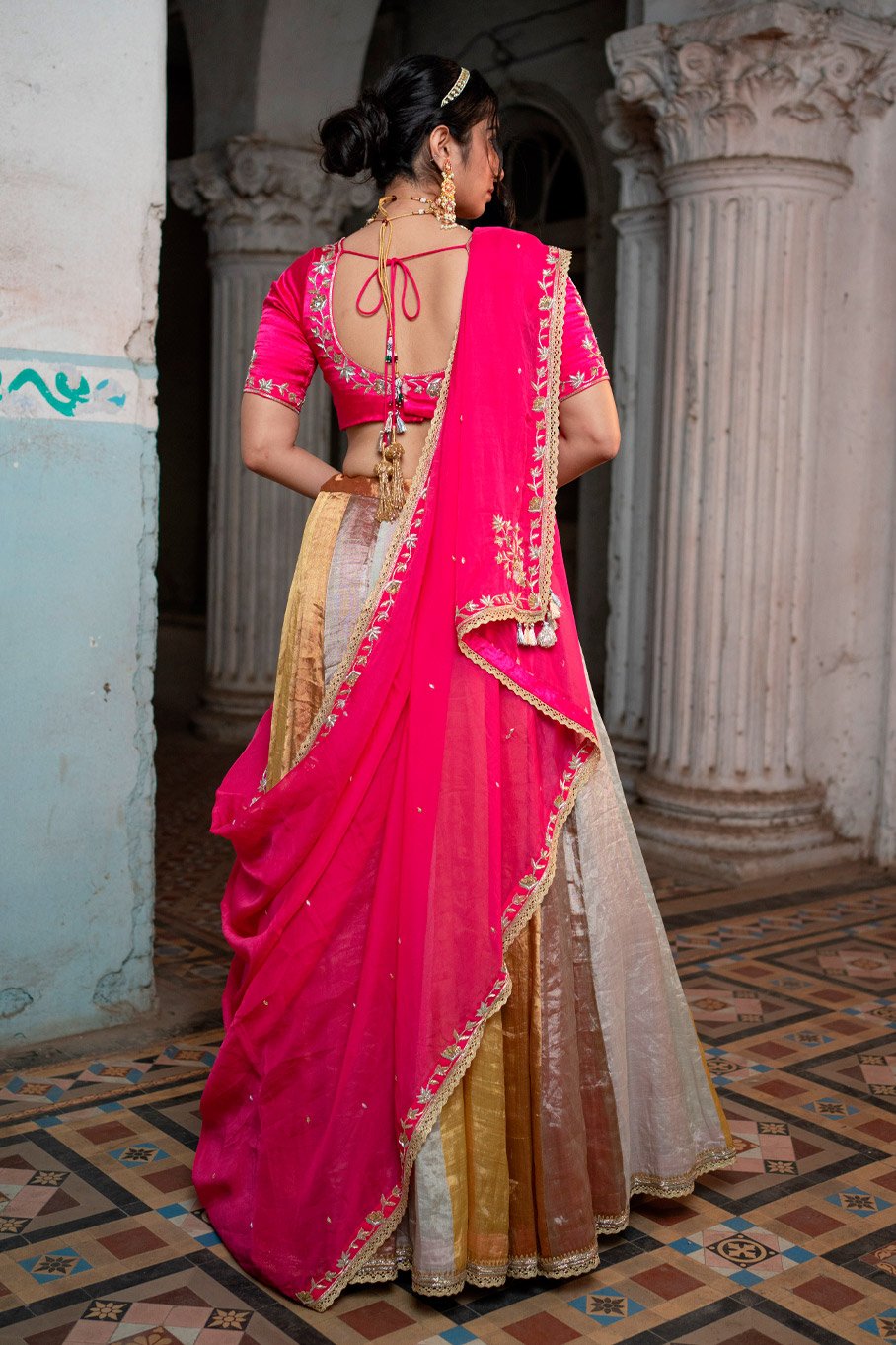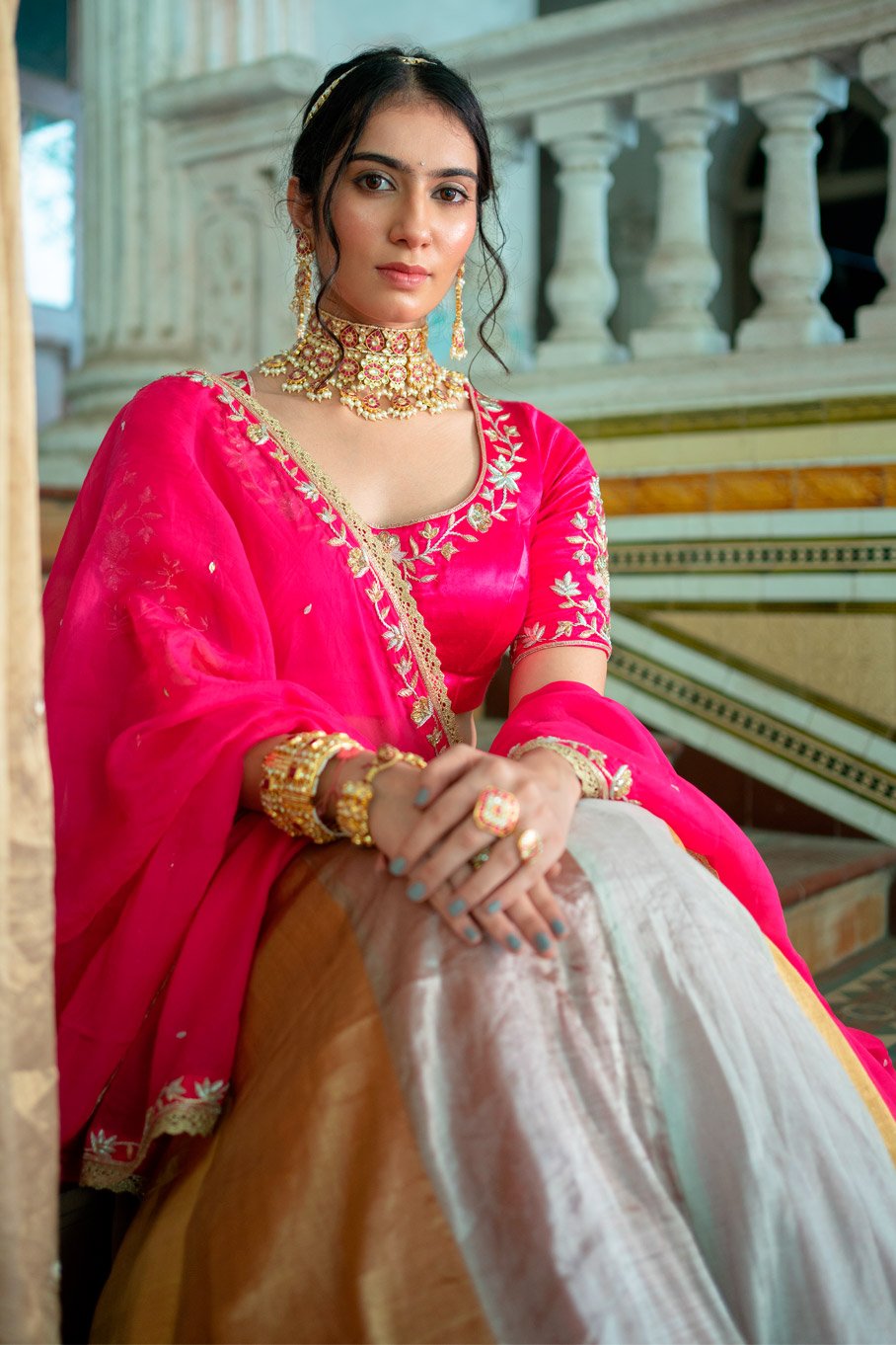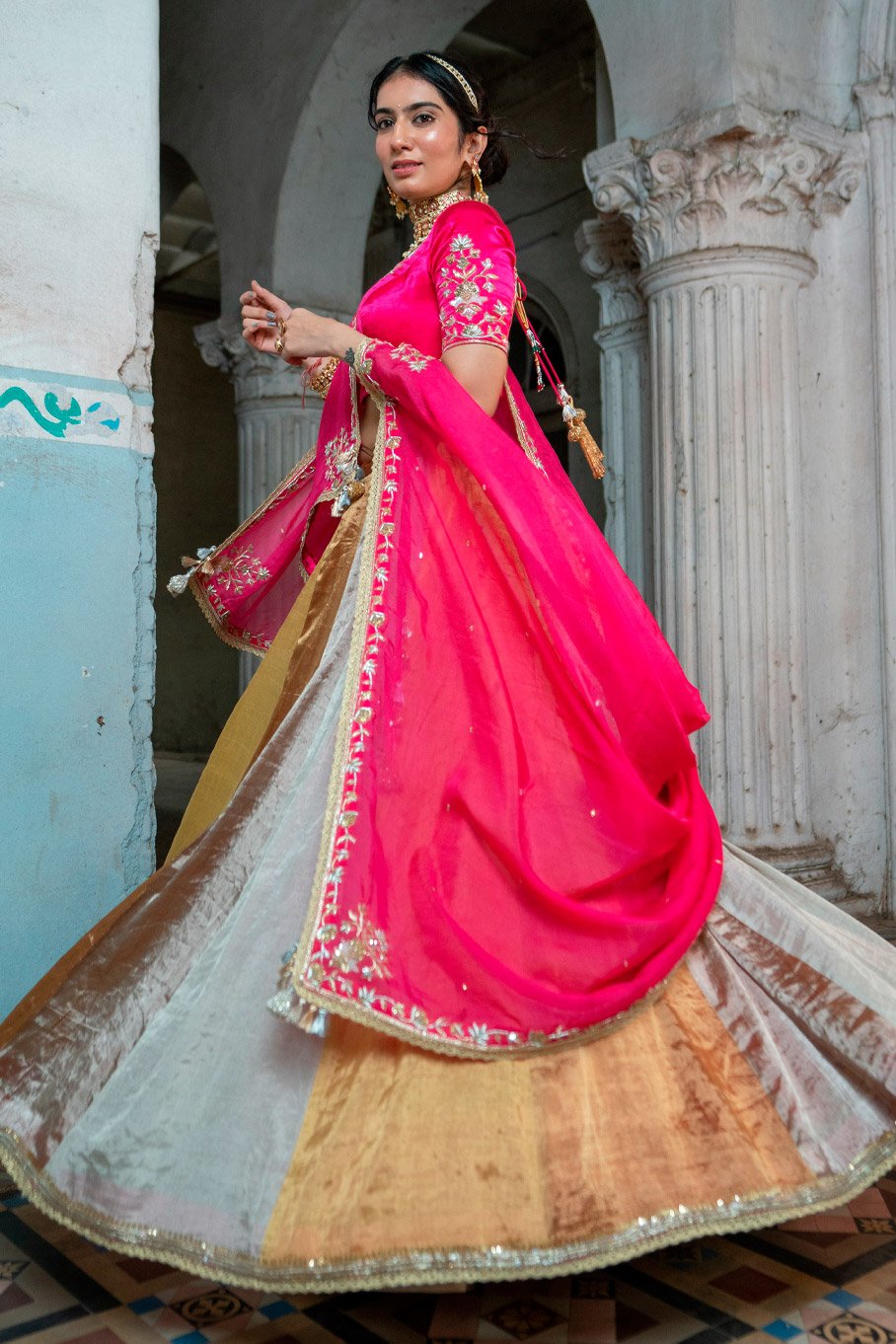 - Design: Signature Zari Tissue Multipaneled Lehenga with Pink Embroidered Blouse and Dupatta