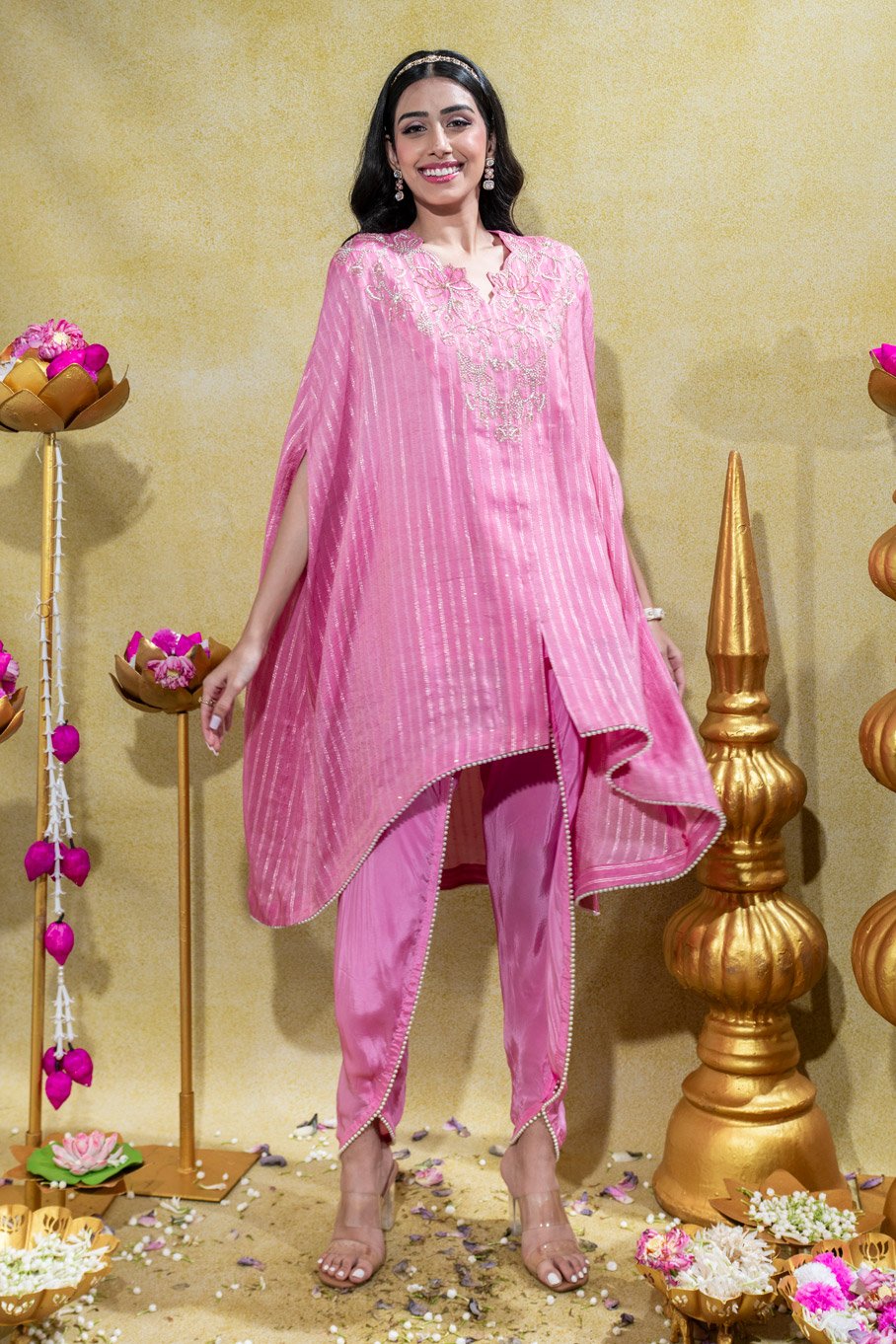 Soft Pink Asymmetric Embriodered Cape with slip and Tulip Pant