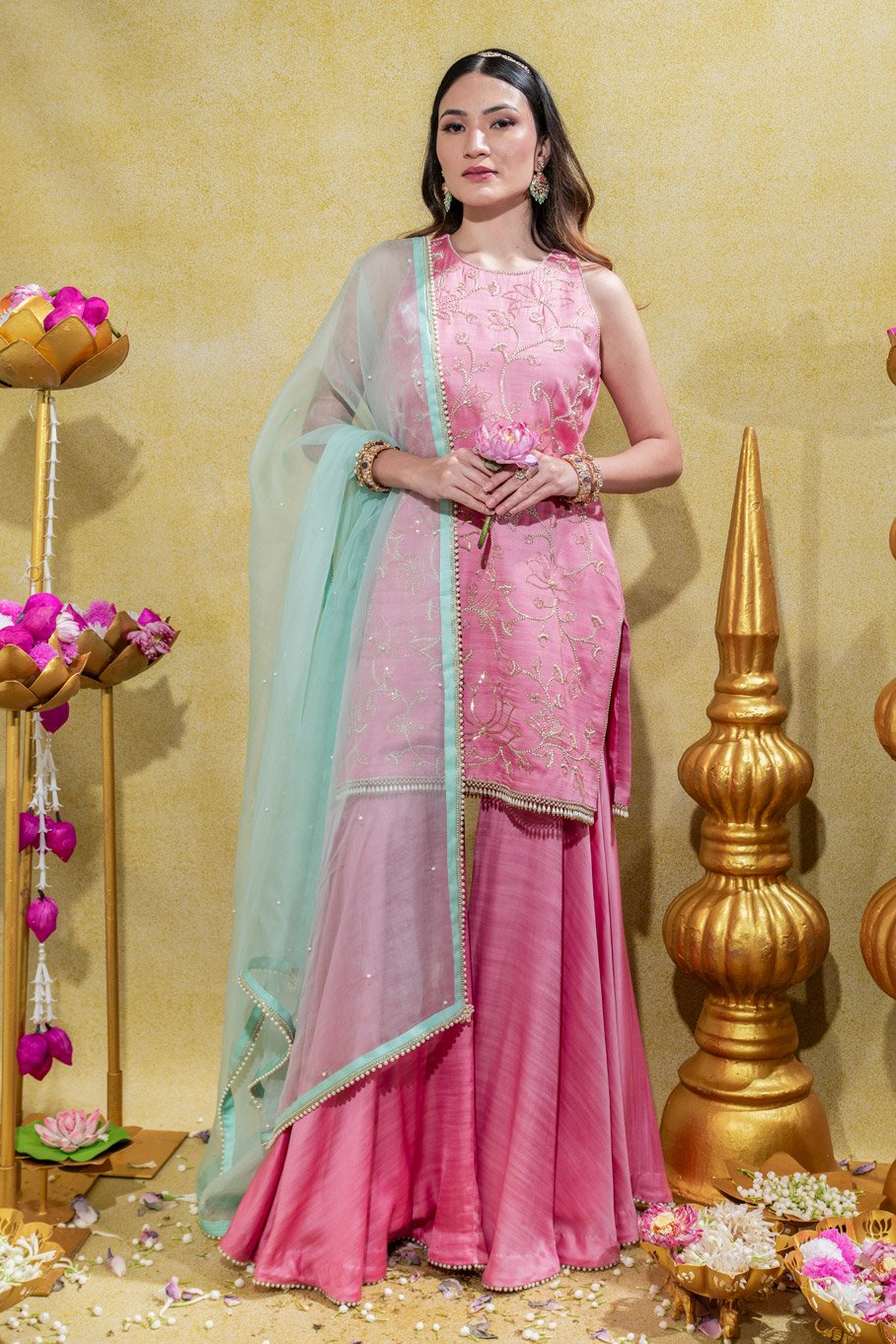 Soft Pink Embroidered Kurti, Gharara Pant And Aqua Embroidered Silk Organza Dupata