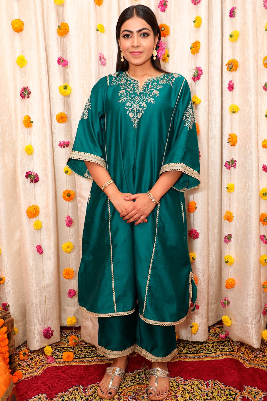 Teal Embroidered Chanderi Choga Set with Straight Pants