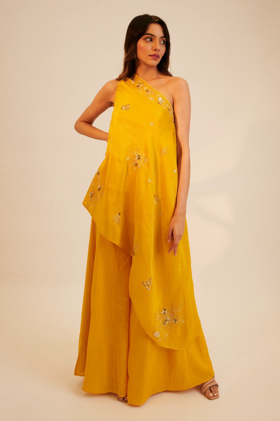 Yellow One Shoulder Asymmetric Embroidered Top Paired With Silk Kalidar Pants